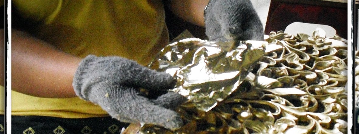 - -Before the glue dries, gold leaves are carefully laid, one by one, over the surface of the carving with a brush, until all of it is covered, down to its smallest corner.