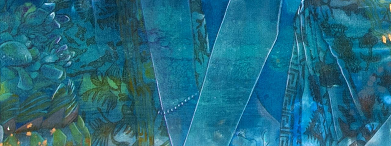Dominated by colours blue, green, reddish-pink, bronze, gold and white, from a distance the composition appears as a milieu of non-descript abstract forms, upon closer inspection, however, much more is revealed. The beautiful young women, dressed in traditional Balinese attire, provide the anchor and pathway into understanding the depth of this extraordinary work.