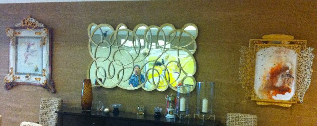 42 x 30.7 inches. Gouache, mixed media, Gold leaf,on paper laid on canvas, 2012. Private collection.