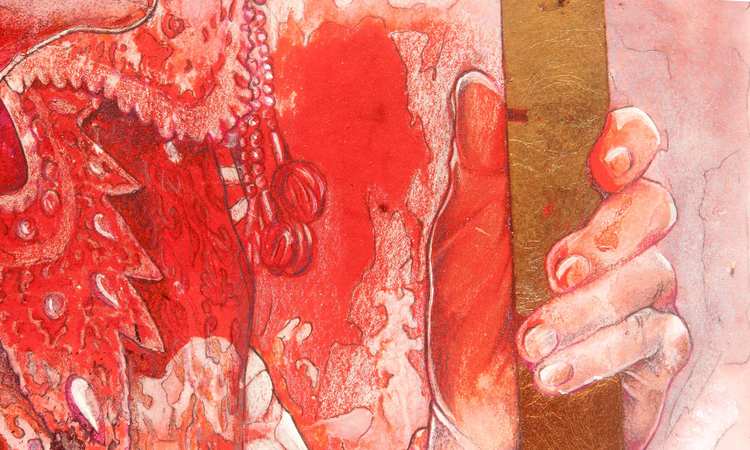 Title: Gentle by the Beast. Specifications: 42 x 30.7 inches. Gouache, mixed media, silver leaf, on paper laid on canvas. Year: 2020. (…)